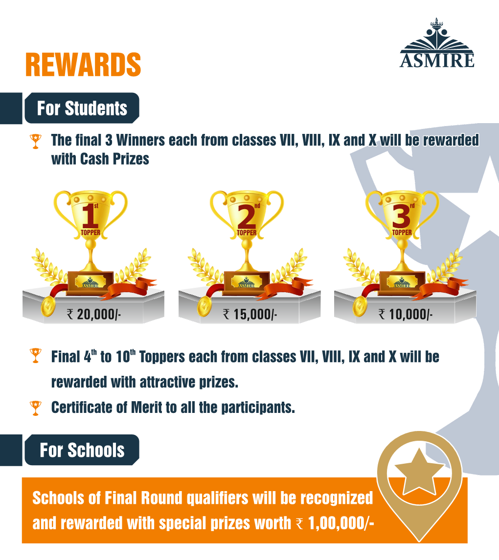| Results | Top 10 students each from classes VII, VIII, IX & X will qualify for Round II | Top 3 students each from classes VII, VIII, IX & X based on their cumulative score of Round I and Round II will be recognized and rewarded as final winners of ASMIRE 2025. |